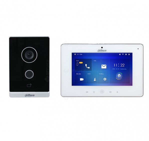 KTW01 este un kit de videointerfon IP, de la Dahua. Acesta este fiabil, accesibil si usor de utilizat. Are in componenta sa 1 post de exterior DHI-VTO2211G-WP si 1 post de interior cu ecran de 7 inch DHI-VTH5221DW-S2. Postul de exterior dispune de camera cu cu senzor 1/2.8 inch CMOS, rezolutie de 2 MP (Full HD-1920 x 1080 pixeli), iluminator IR automat si unghi de vizualizare de 125°, 72°, 142° (orizonatala, verticala, diagonala). Beneficiaza, de asemenea de functii importante cum ar fi WDR, reducerea zgomotului 3D, auto comutare ICR, detectia miscarii, night vision etc. Permite comunicare bidirectional "dual-way", configurare Web sau control de la distanta prin intermediul aplicatiei (DMSS/gDMSS - Android/iDMSS - iOS). Modalitatea de deblocare se face pe baza de card tip IC (max. 10.000) cu distanta de citire de 3-5 cm, de la postul de interior sau de pe smartphone. Are carcasa de culoare neagra fabricata din PC+acril, montajul se realizeaza aparent, gardul de protectie fiind garantat de standardul IP65. Alimentarea se va face la 12V DC/1 A sau PoE, iar temperatura optima de functionare este cuprinsa in intervalul -30°C si +60°C.